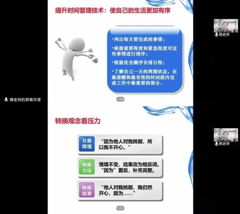 海南大学管理学院傅国安教授以“从压力感到幸福感:现代人心理健康与心理调适”为主题,讲述了工作压力的前因后果、如何进行压力管理、诱发倦怠的个人因素、现代人应如何把压力转变为幸福感,以及调节压力的方法等方面的内容。