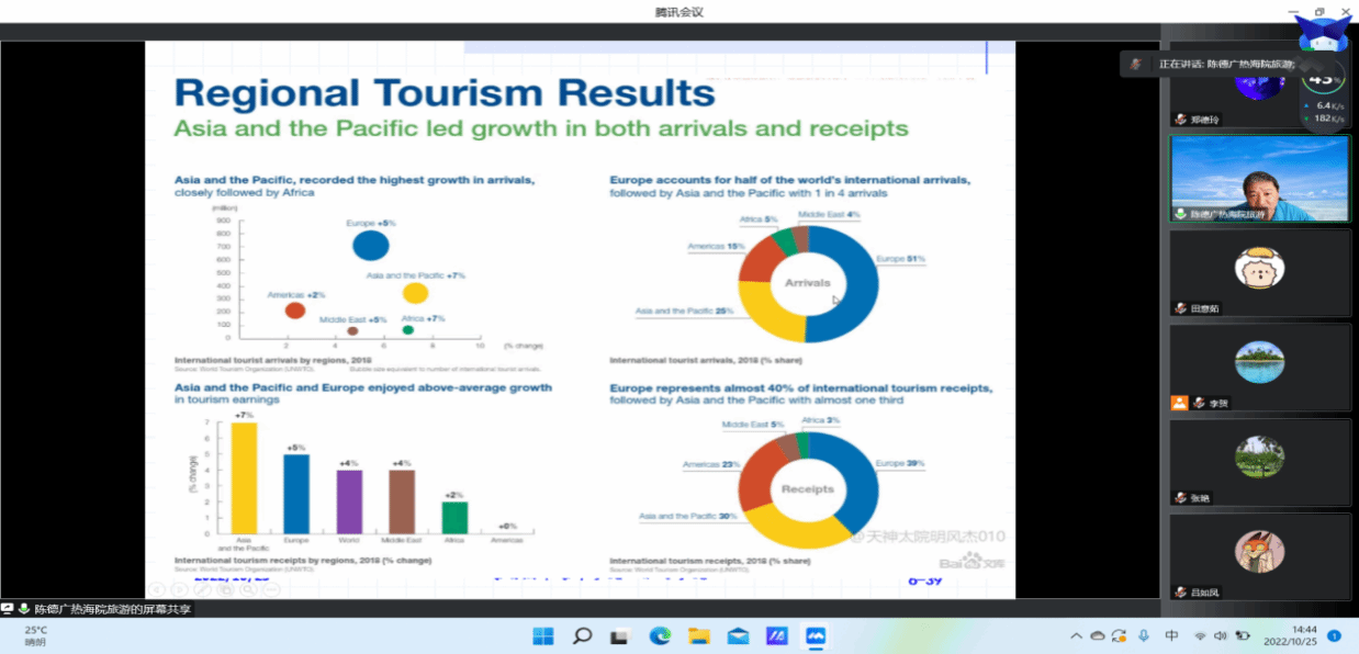 在10月25日下午同时举办的两场专题线上讲座中,海南热带海洋学院副院长陈德广博士以“旅游人才职业生涯与相关匹配岗位的思考”为主题,以海南建设国际旅游消费中心为例,从世界和我国旅游业的发展态势与职业机遇、我国旅游业与旅游教育发展的历史回顾、我国旅游业发展前景与人才需求和国内部分旅游行业与企业岗位设置与技能要求等四个方面进行了细致的阐述。