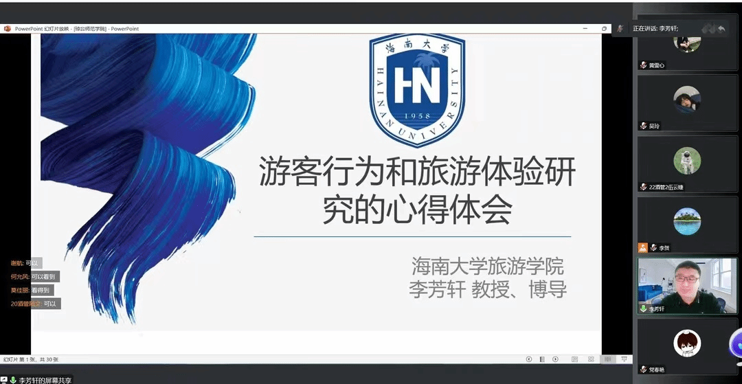 在10月18日下午同时举办的两场专题线上讲座中,海南大学李芳轩教授以“游客行为和旅游体验研究的心得体会”为主题,讲述了旅游管理、酒店管理和会展经济与管理专业的前世今生、大学生活中目标感的重要性、本科生与研究生的差别、游客行为和旅游体验研究的心得体会等方面的内容,并以自己研究多年的心得体会为案例向师生传授学习经验。