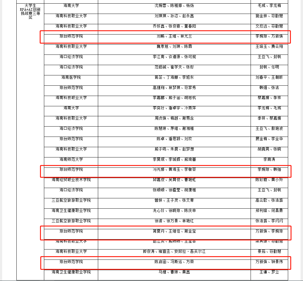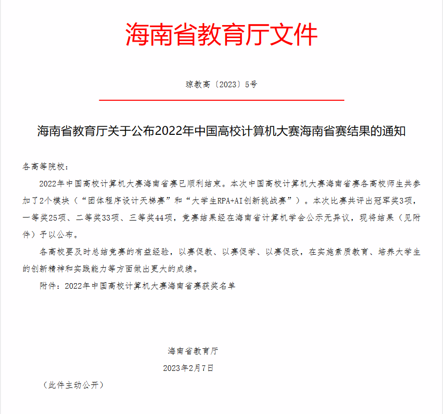 近日,海南省教育厅公布了2022年中国高校计算机大赛海南省赛结果,我院派出5支代表队参加了本次大赛中的“大学生RPA+AI创新挑战赛”赛项,其中4支代表队均获得省赛三等奖的好成绩。