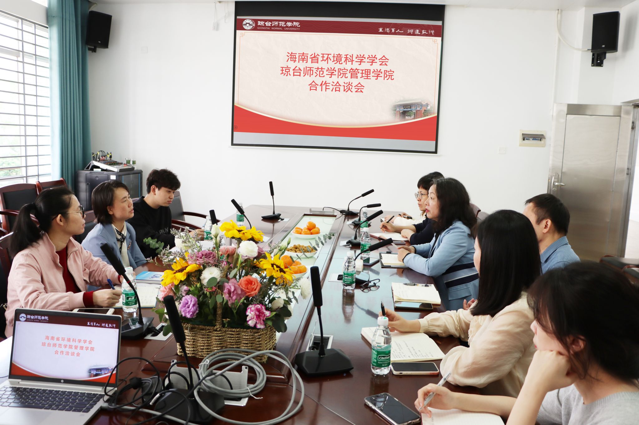 3月9日上午,海南省环境科学学会副秘书长张翠萍、陈晓芸、刘瀚文一行到我院开展合作洽谈。双方在培训楼202会议室召开座谈会,院长张艳、党总支书记颜松海、副院长李婉琼出席会议,学工办全体老师参加了此次会议。