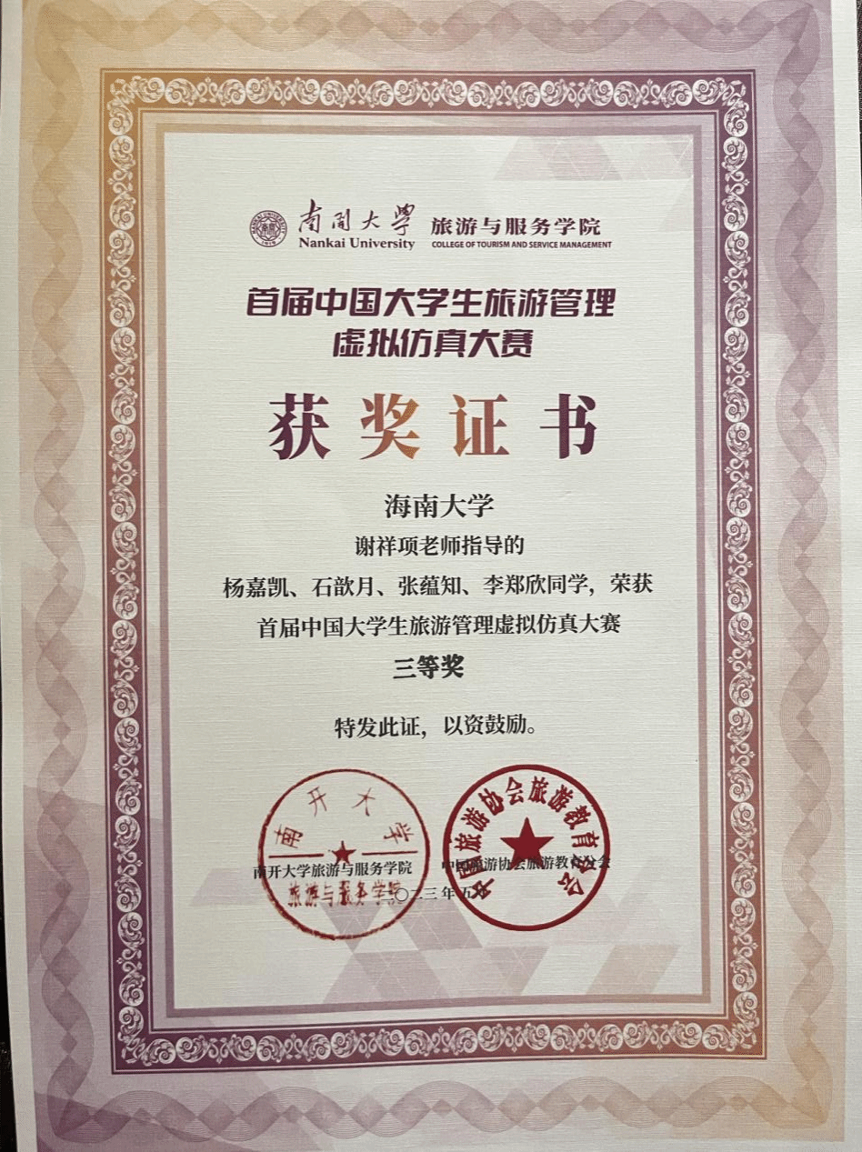 5月25—28日,中国旅游协会旅游教育分会与南开大学旅游与服务学院联合举办的“首届中国大学生旅游管理虚拟仿真大赛”决赛在南开大学线下举办,来自琼台师范学院21级酒店管理专业赴海南大学交流的张蕴知、石歆月、李郑欣三名学生与海南大学本校学生杨嘉凯同学组成的“少年先锋队”经过线上对抗和现场答辩等环节的激烈比拼,最终在包括南开大学、厦门大学、华南师范大学、云南大学、北京第二外国语大学、澳门城市大学等在内的78支决赛队伍中荣获三等奖,谢祥项老师荣获“优秀指导老师”称号。