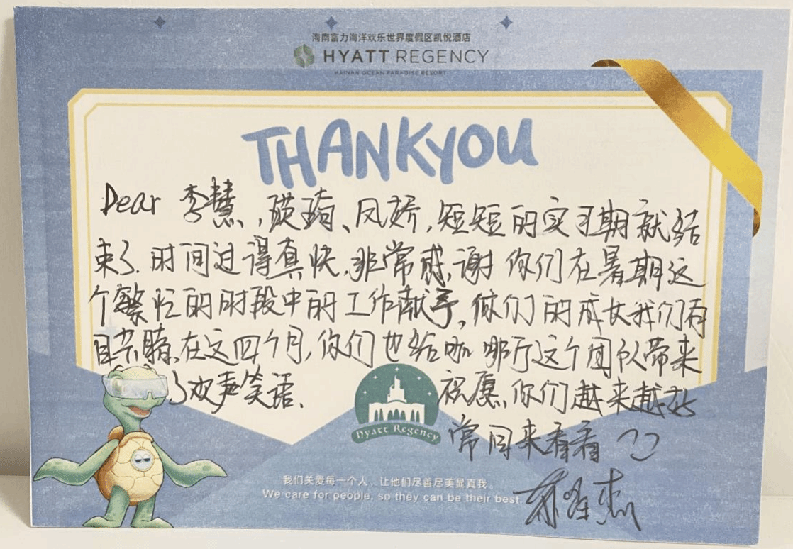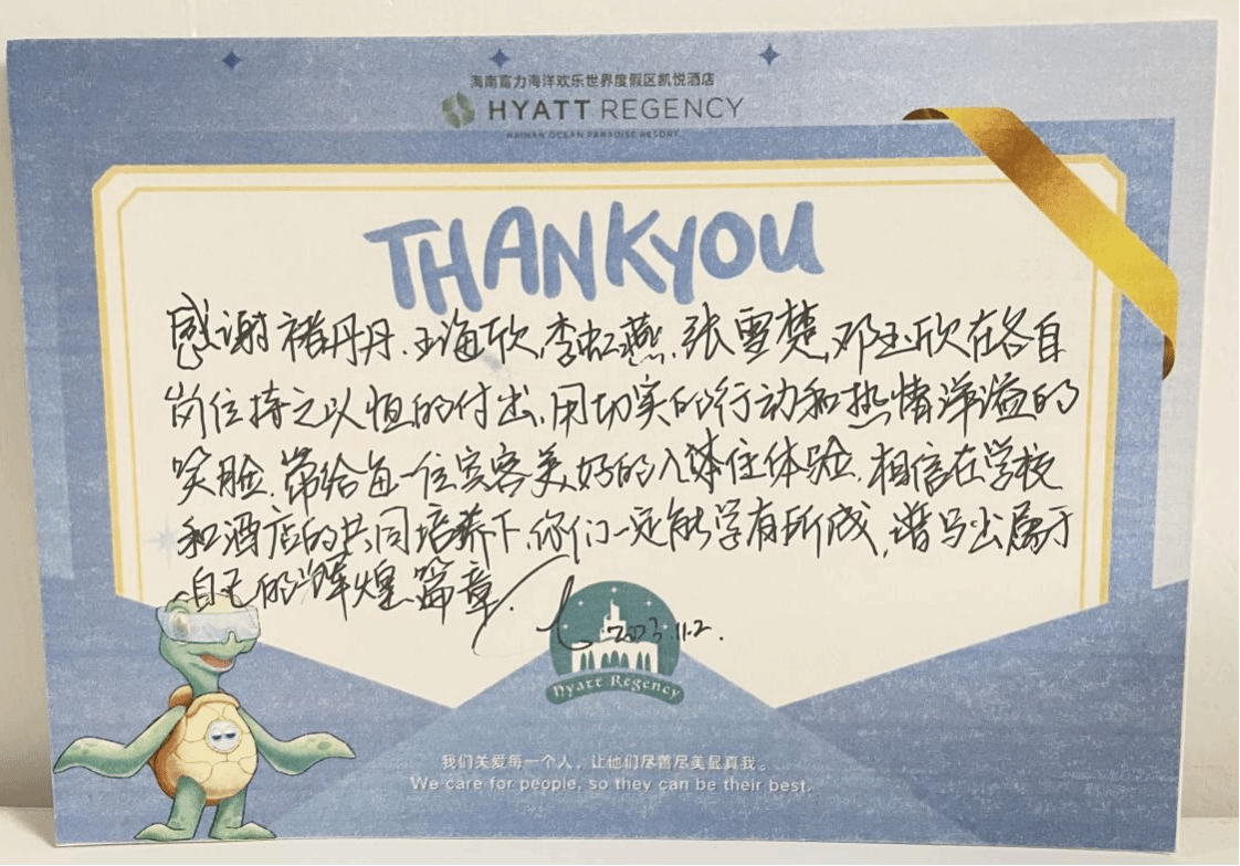 酒店还为我院实习生们举办了别具一格的欢送会,氛围热烈亲切。会上,酒店管理层对我院实习生们四个月以来的付出表示了感谢,并鼓励实习生们留任,欢迎同学们在毕业后继续回来工作。我院指导老师杨晓玭也对实习生们提出了寄语,希望同学们通过实习能够更好地进行理论知识与实际工作的衔接,在未来的职业道路上发展得越来越好。会后,酒店向我院发来了感谢信,并附上了各部门经理的手写感谢卡,再次对我院实习生的优异表现表达赞赏和感谢。