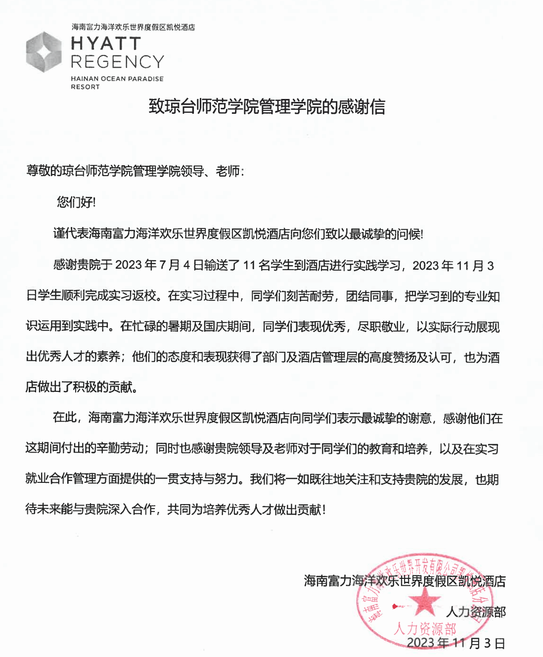 为进一步了解并提升我院实习生的实践能力,优化酒店管理专业人才的培养模式,我院实习指导老师杨晓玭在10月30日-11月1日,前往海南富力海洋欢乐世界度假区凯悦酒店,进行实习生慰问和酒店合作沟通工作。