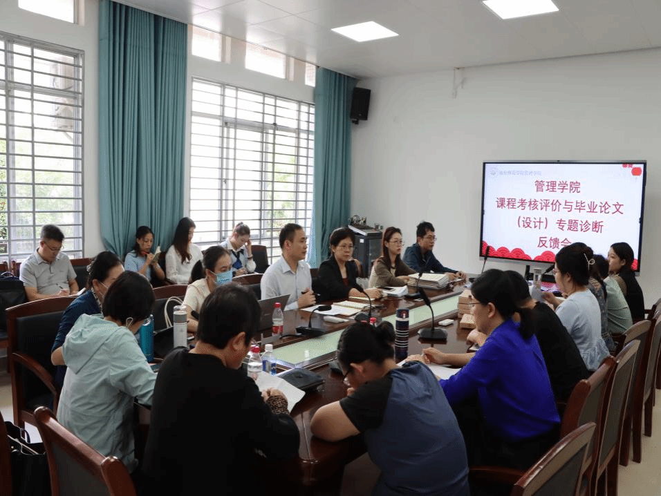 28日下午,我院在培训楼202会议室召开课程考核评价与毕业论文(设计)专题诊断反馈会,颜松海书记、李婉琼副院长以及全体教师参加此次会议,会议由李婉琼副院长主持。会上,李婉琼副院长通报了评估专家进行专题诊断和专家反馈会的有关情况,详细梳理了我院在课程考核评价和毕业论文(设计)工作中存在的问题和不足,对接下来的专项整改工作进行动员部署。与会教师也纷纷结合自身开展课程考核评价和毕业论文(设计)工作的经验和做法进行交流讨论。颜松海书记在总结讲话中要求全体教师进一步提高思想认识,切实增强责任感、使命感和紧迫感,加大工作力度,提高工作效率,保质保量完成课程考核评价与毕业论文(设计)的整改工作任务。