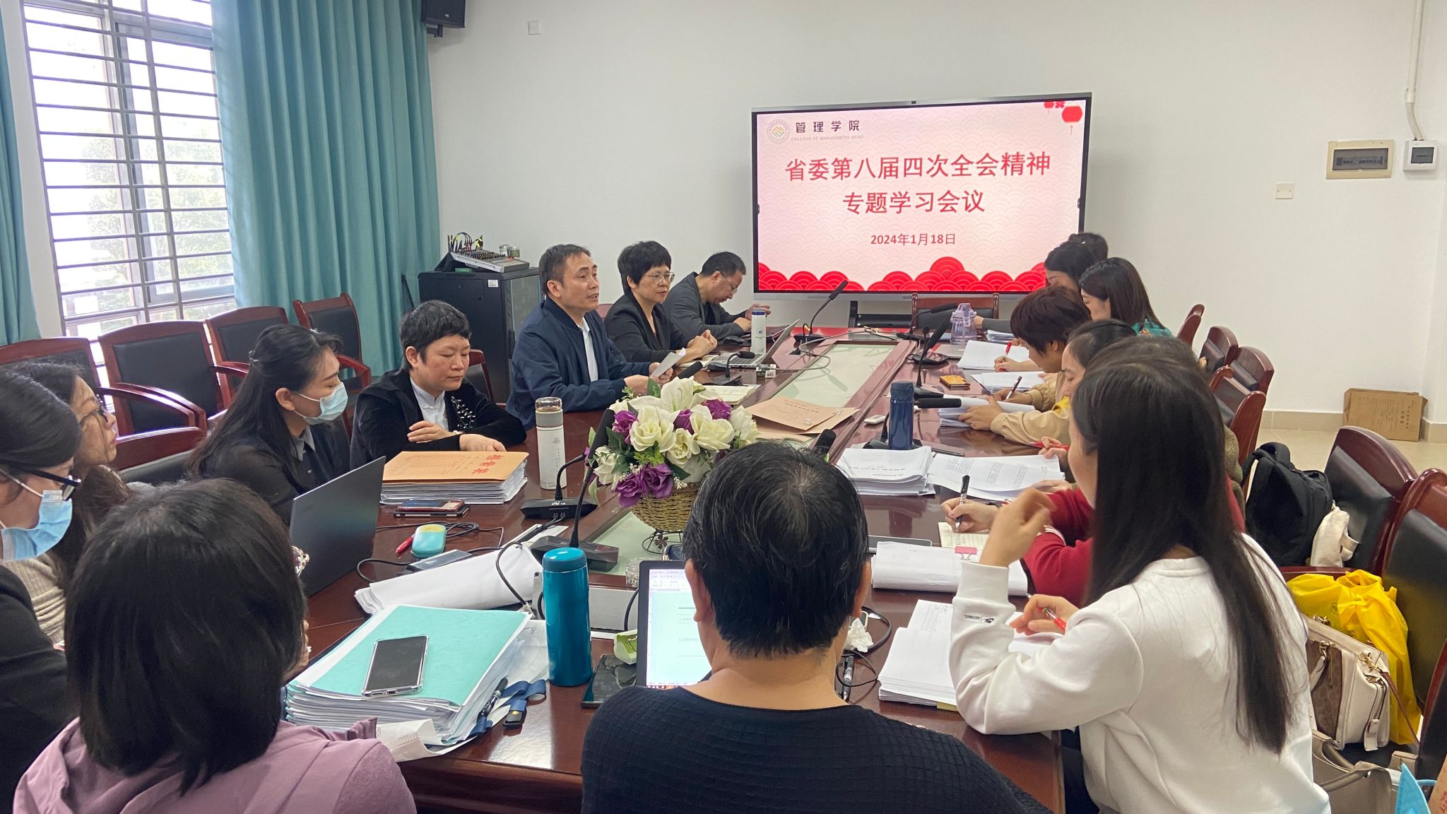 1月18日下午,管理学院在培训楼202会议室召开传达学习省委第八届四次全会精神专题会议,研究贯彻落实措施。会议由管理学院党委书记颜松海主持,学院全体教职工参加会议。