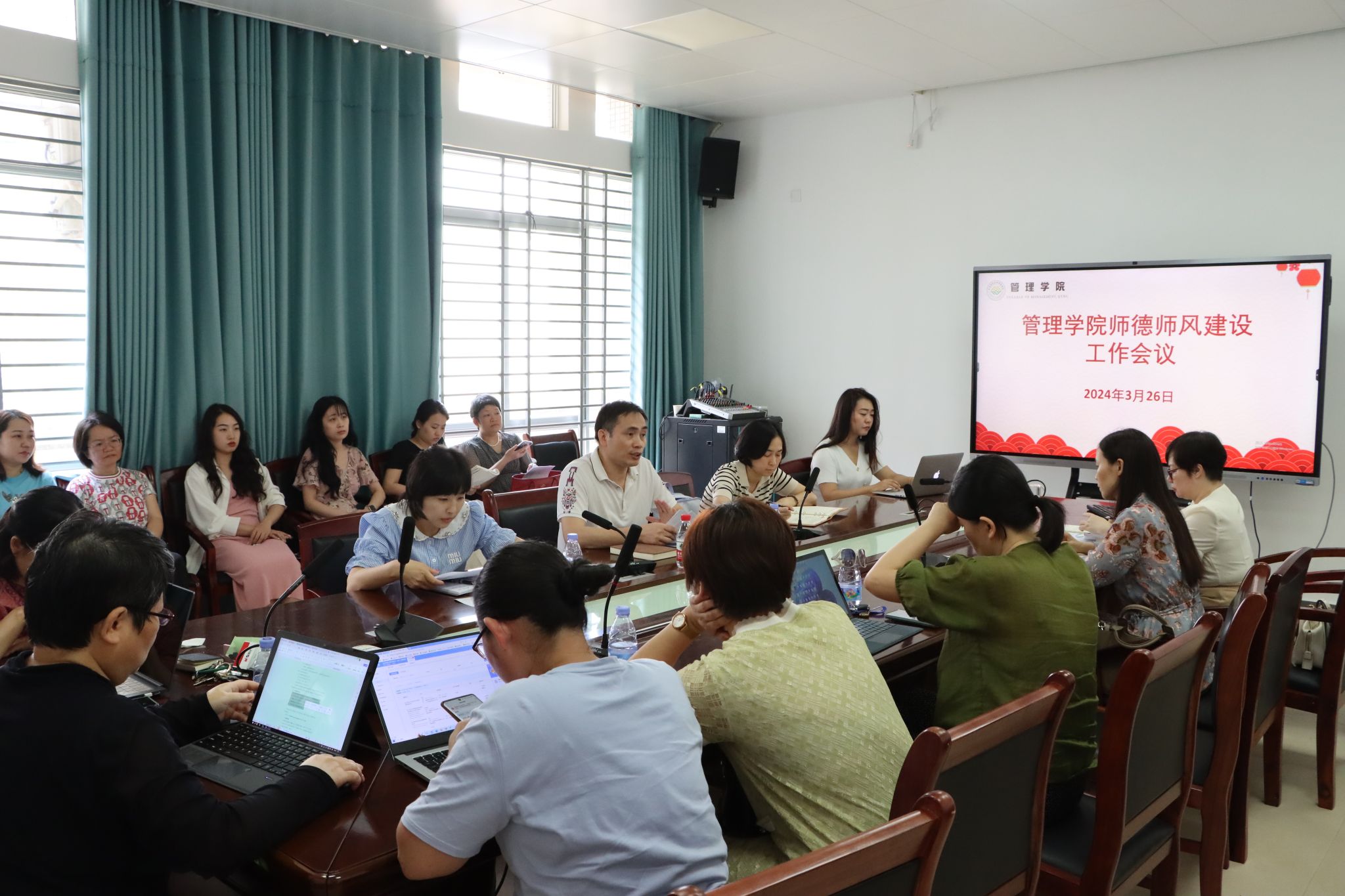 3月26日下午,我院在培训楼202会议室召开师德师风建设工作会议,旨在进一步加强教师职业道德教育,提升教师队伍整体素质,为培养更多优秀人才奠定坚实基础。学院全体教职工参加会议,会议由管理学院党委书记颜松海主持。