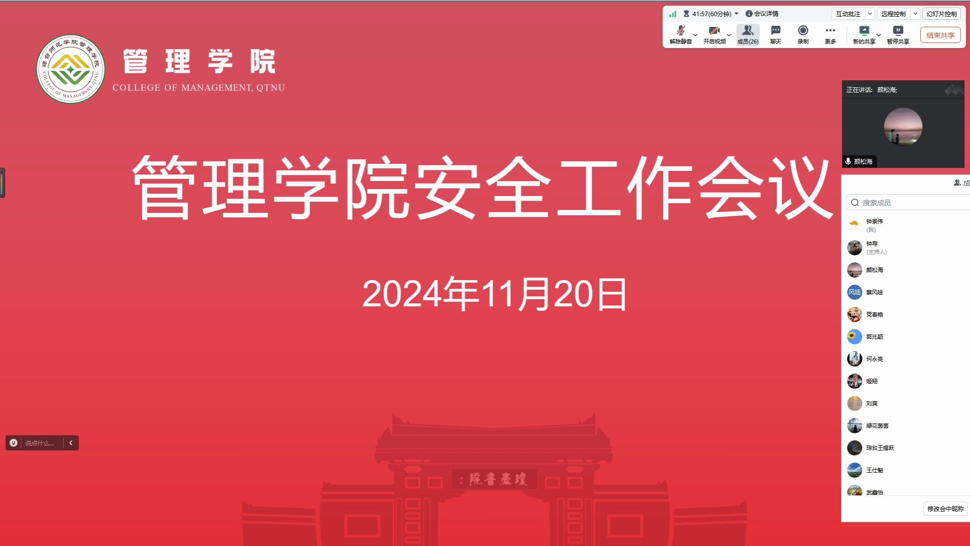 为进一步做好学生安全教育管理工作,强化师生安全意识,管理学院于11月20日上午召开了安全工作会议。此次会议旨在落实学校和学院安全稳定工作要求,彻查安全隐患,补齐漏洞短板,为师生创造一个安全、稳定、和谐的学习和工作环境。会议由管理学院党委书记颜松海主持,学院领导班子成员、全体辅导员、行政人员、班主任参加了会议。