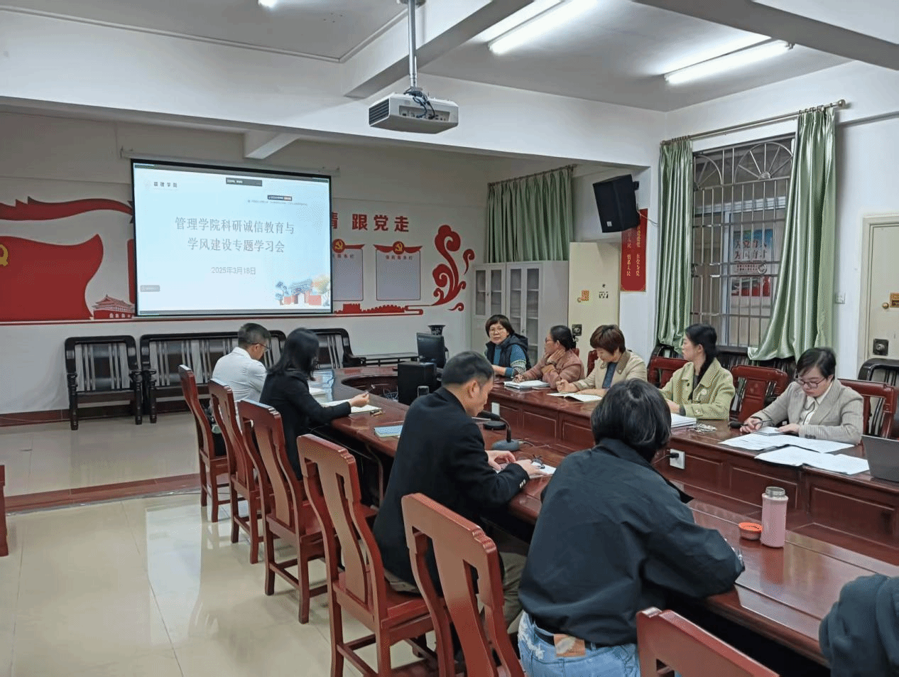 2025年3月18日下午,管理学院在府城校区电教楼四楼会议室召开科研诚信教育与学风建设专题学习会。学院党政领导以及全体教师参加会议,会议由学院副院长李婉琼主持。