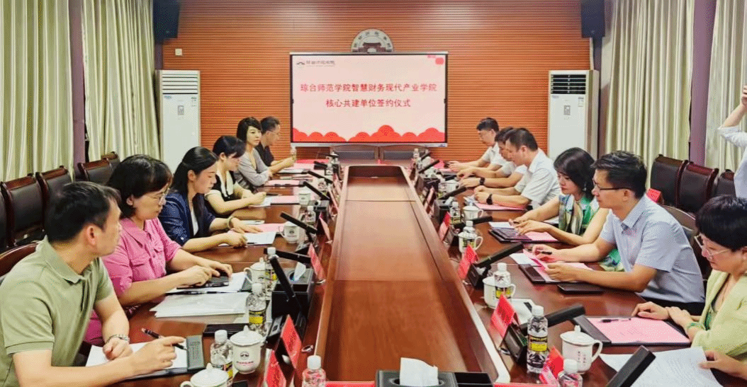 2025年7月9日上午,琼台师范学院智慧财务现代产业学院核心共建单位签约仪式在文脉圣地琼台书院博物馆一楼会议室举行。此次活动标志着学院积极响应海南省教育厅《海南省现代产业学院建设总体方案》,深化产教融合、探索“一院双园”人才培养新模式的重要里程碑。琼台师范学院副校长岳曼曼、管理学院党委书记颜松海、教务处副处长袁霞、管理学院副院长李婉琼、魏晓楠及相关教师代表,与海南鼎方科技集团有限公司、海南航天信息有限公司、琼山区企业服务行业协会、用友网络/新道科技股份有限公司等企业代表出席,共同见证这一历史性时刻。