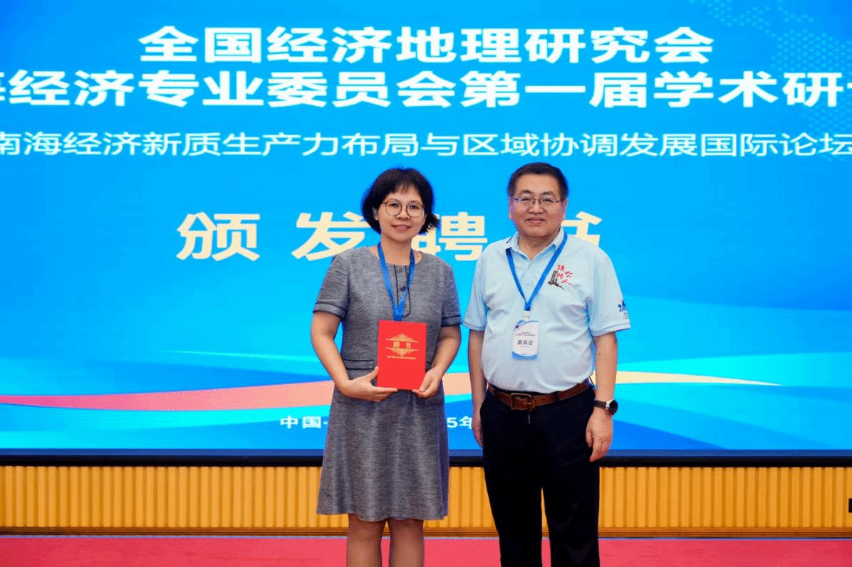 系主任王英哲代替张艳教授分享了琼台师范学院生态经济研究中心的研究成果,探讨林业碳汇在优化南海区域经济地理布局中的作用,分析碳汇交易机制如何促进新质生产力发展,并提出“绿色金融+地理协同”模式,助力海南实现碳中和目标,拓展区域经济地理视角。