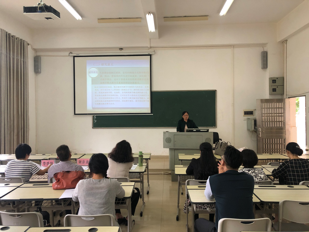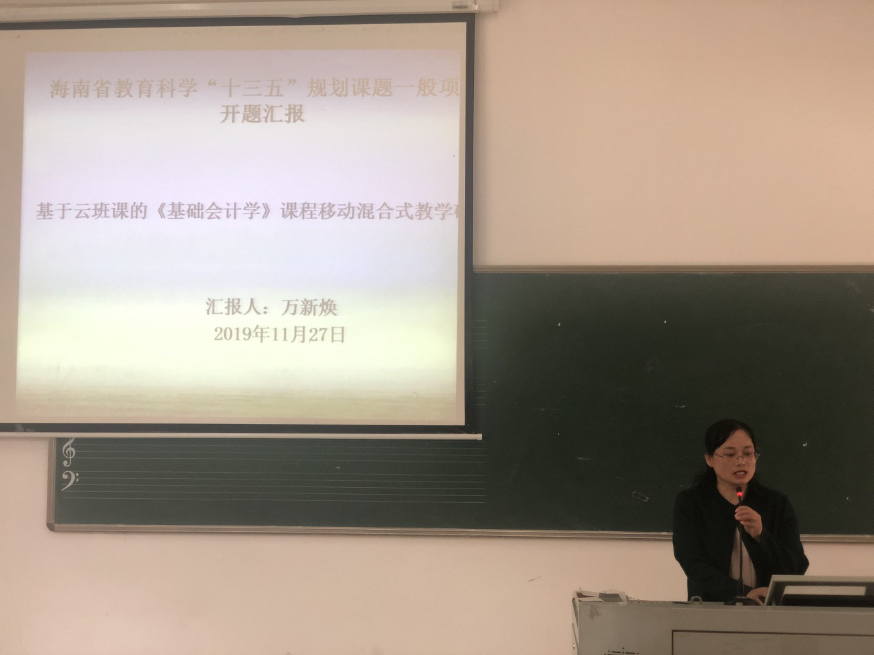 2019年11月27日上午,我院万新焕老师做海南省教育科学“十三五”规划课题“基于云班课的《基础会计学》课程移动混合式教学研究”开题汇报。