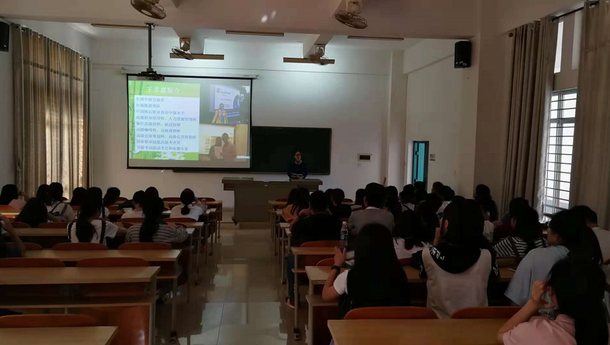 王教授从现在最为流行的“海南自贸区(港)建设与旅游酒店专业的机遇”切入主题,高屋建瓴地介绍了海南自贸区(港)战略规划,深入分析了海南酒店行业的人才现状、海南高等院校酒店管理人才培养现状以及海南酒店人才未来发展趋势。王教授用大量的数据,详细解读了酒店管理专业薪酬、酒店管理专业人才晋升途径、酒店人才需求的数量和要求等。王教授还从职业生涯规划的角度,结合生动案例跟同学们分享了沟通能力、协调能力、理解能力、外语能力等在个人职业发展中的作用,并阐明了这些能力的培养路径。她鼓励大家努力学好旅游酒店专业知识,提升专业能力,成为国际旅游岛建设和海南自贸区(港)所需的优秀人才。