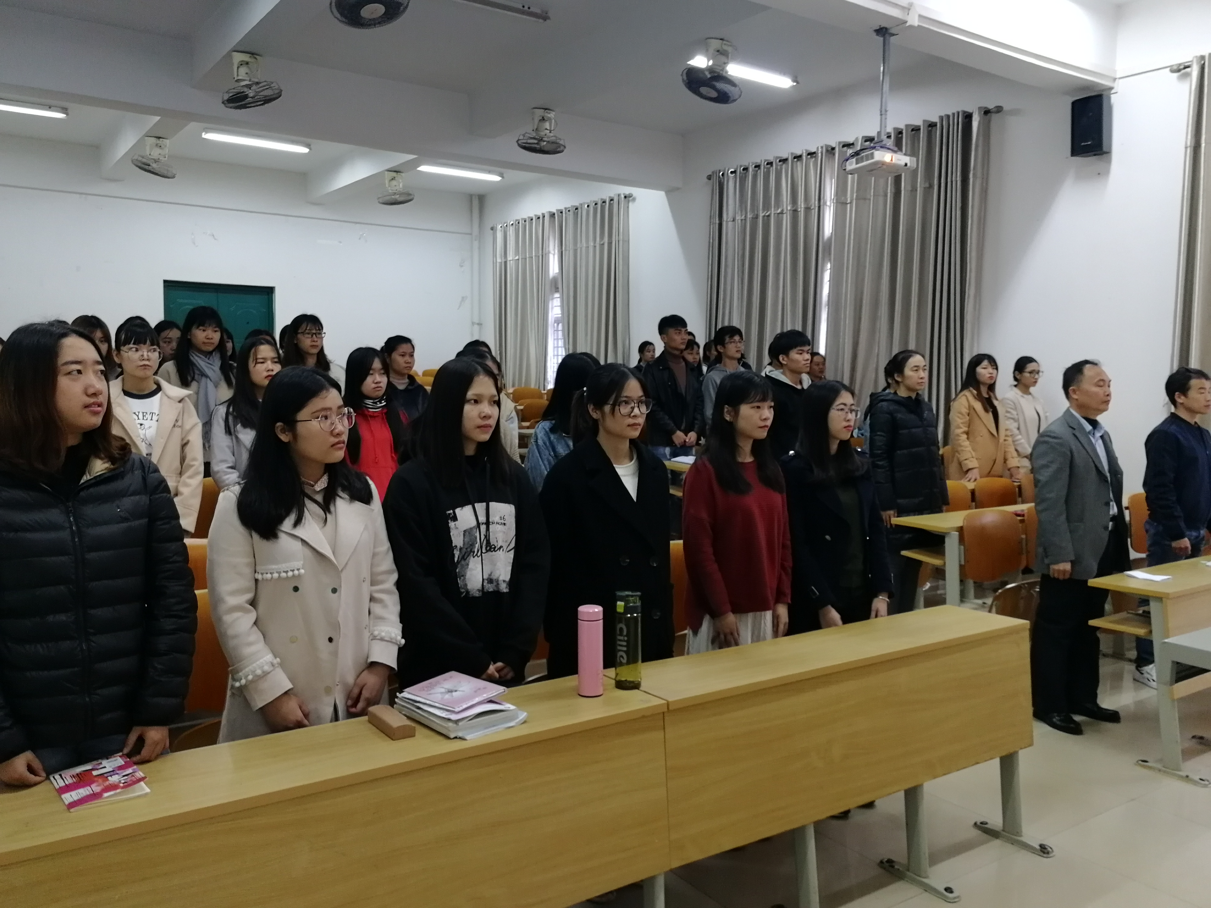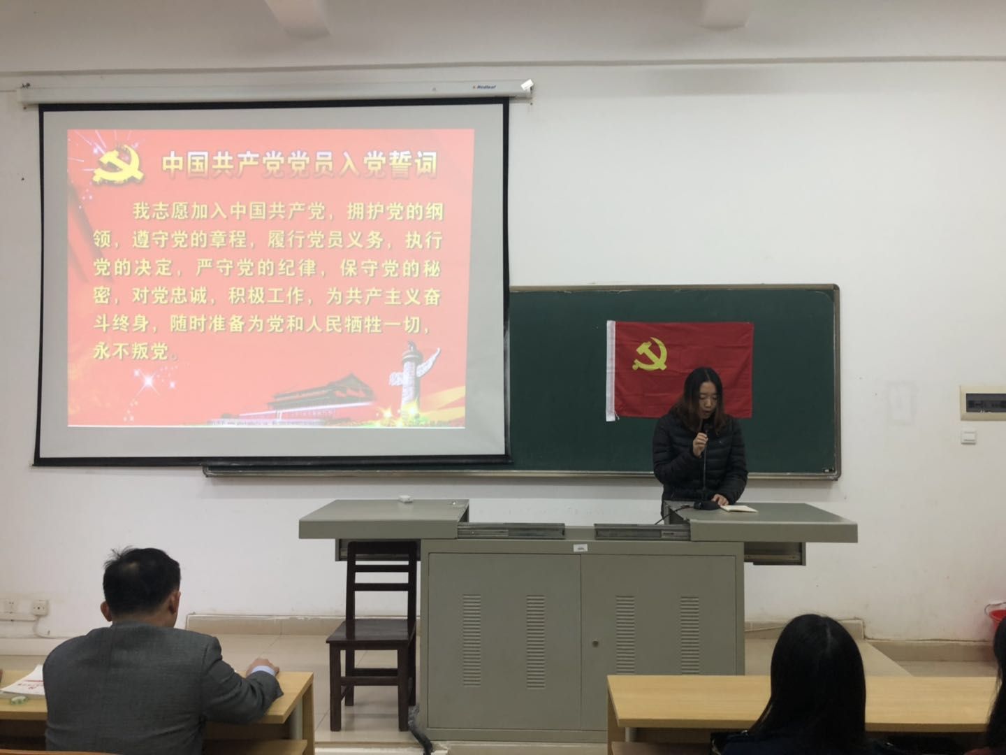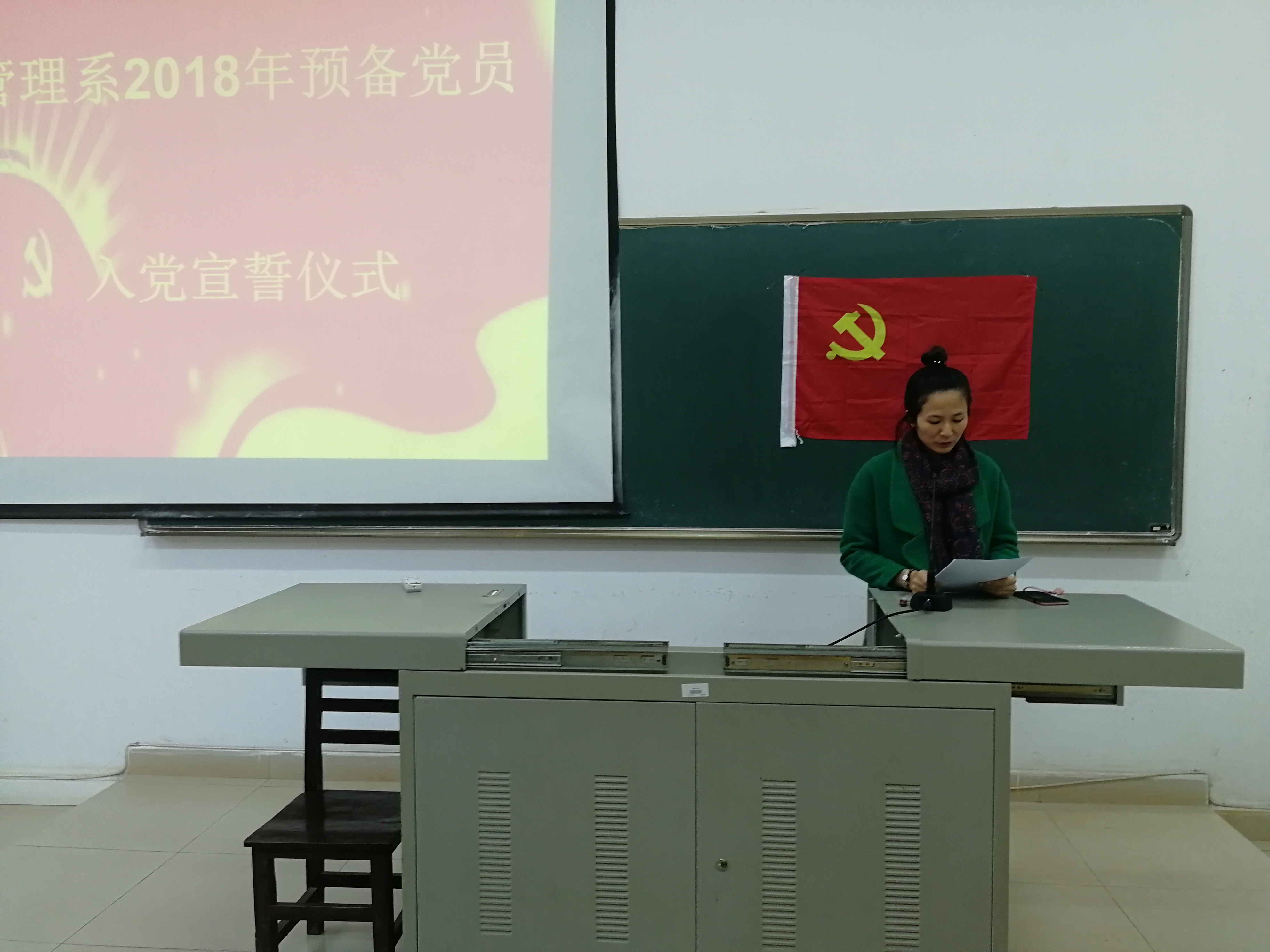 2019年1月3日下午4:00在培西102举行入党宣誓仪式,学生党支部书记林文曼同志主持宣誓仪式,管理系党总支书记符永同志,教工支部组织委员吉小华同志,学生党支部何永亮同志,辅导员曹方远同志,7名预备党员,部分学生党员和入党积极分子参加宣誓仪式。