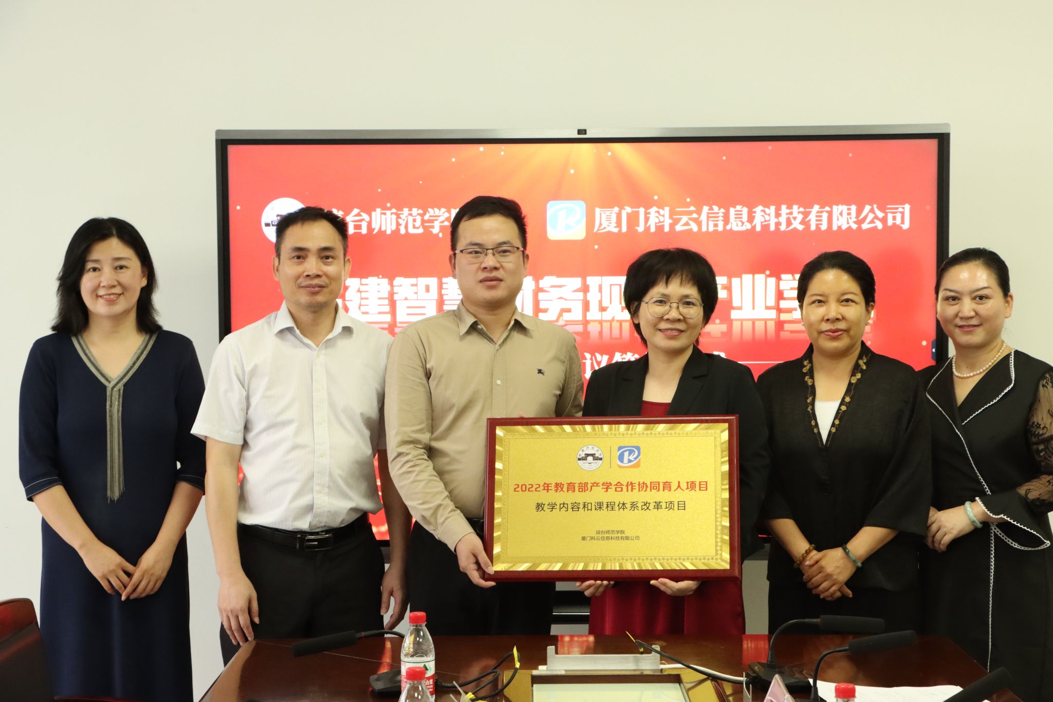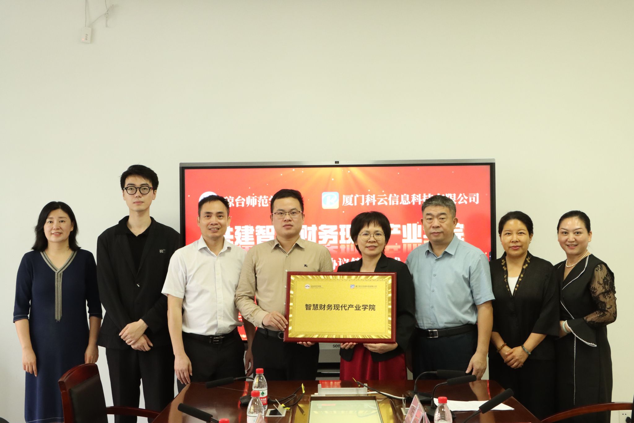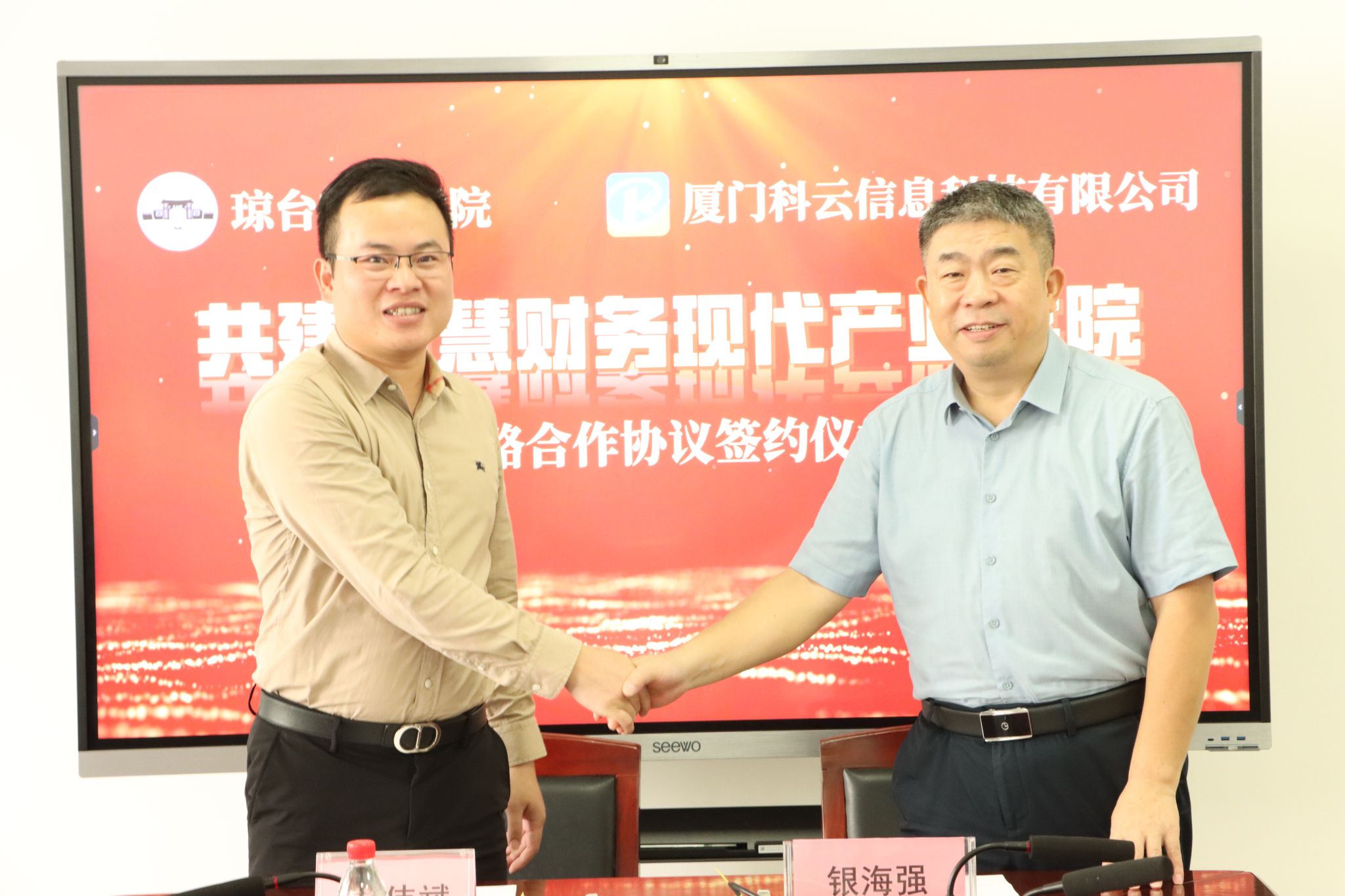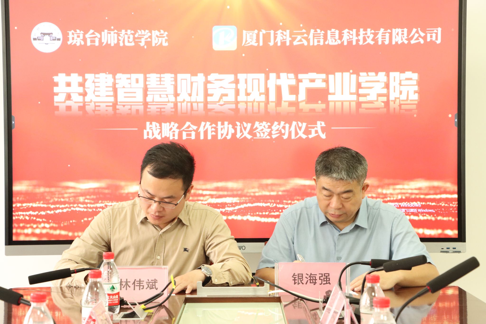 2023年10月29日上午,琼台师范学院与厦门科云信息科技有限公司共建“智慧财务现代产业学院”签约仪式在管理学院举行。银海强副校长代表学校与企业负责人完成了签约、授牌等仪式。教务处石晶处长、管理学院党政领导和财务管理专业负责人等共同见证了这一重要时刻。