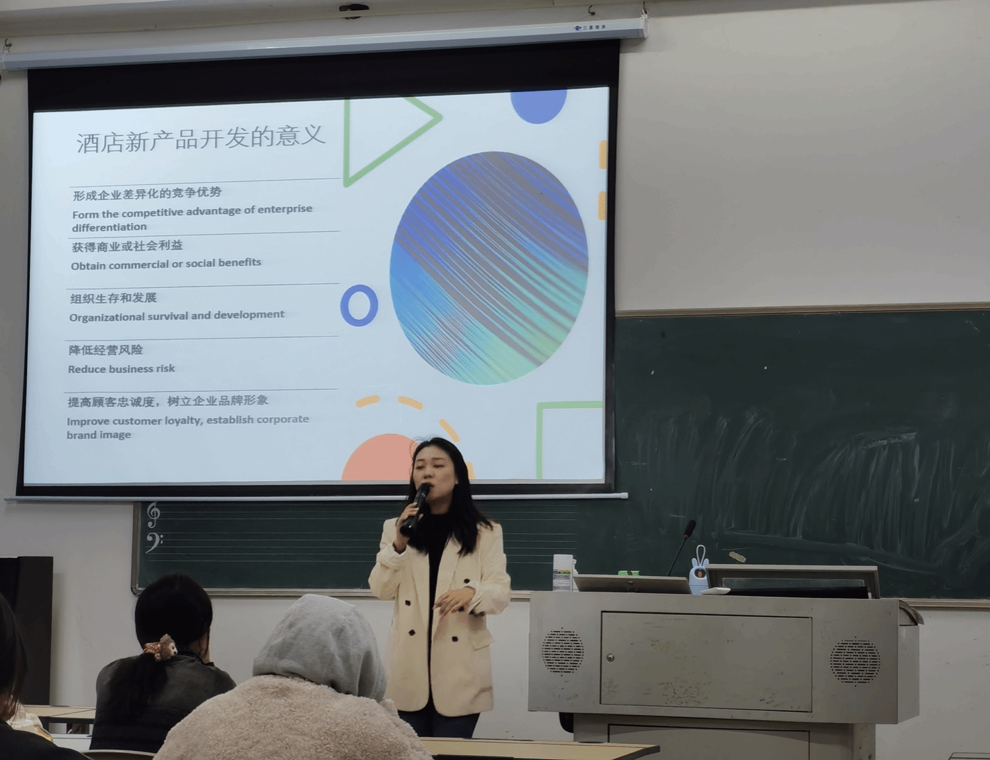 本次公开课主讲教师杨晓玭,为酒店管理专业硕士研究生,马来亚大学商业与经济管理在读博士,拥有良好的专业知识和英语基础。公开课内容为“酒店市场营销中的产品开发与设计”,杨老师使用流利的中英双语,结合学生的专业知识掌握程度,以启发式的问题导向为教学方法,辅以图文并茂的授课形式,带领学生回顾了酒店产品的概念,讲解酒店产品开发与设计的意义,并着重讲授酒店产品开发与设计的全流程。