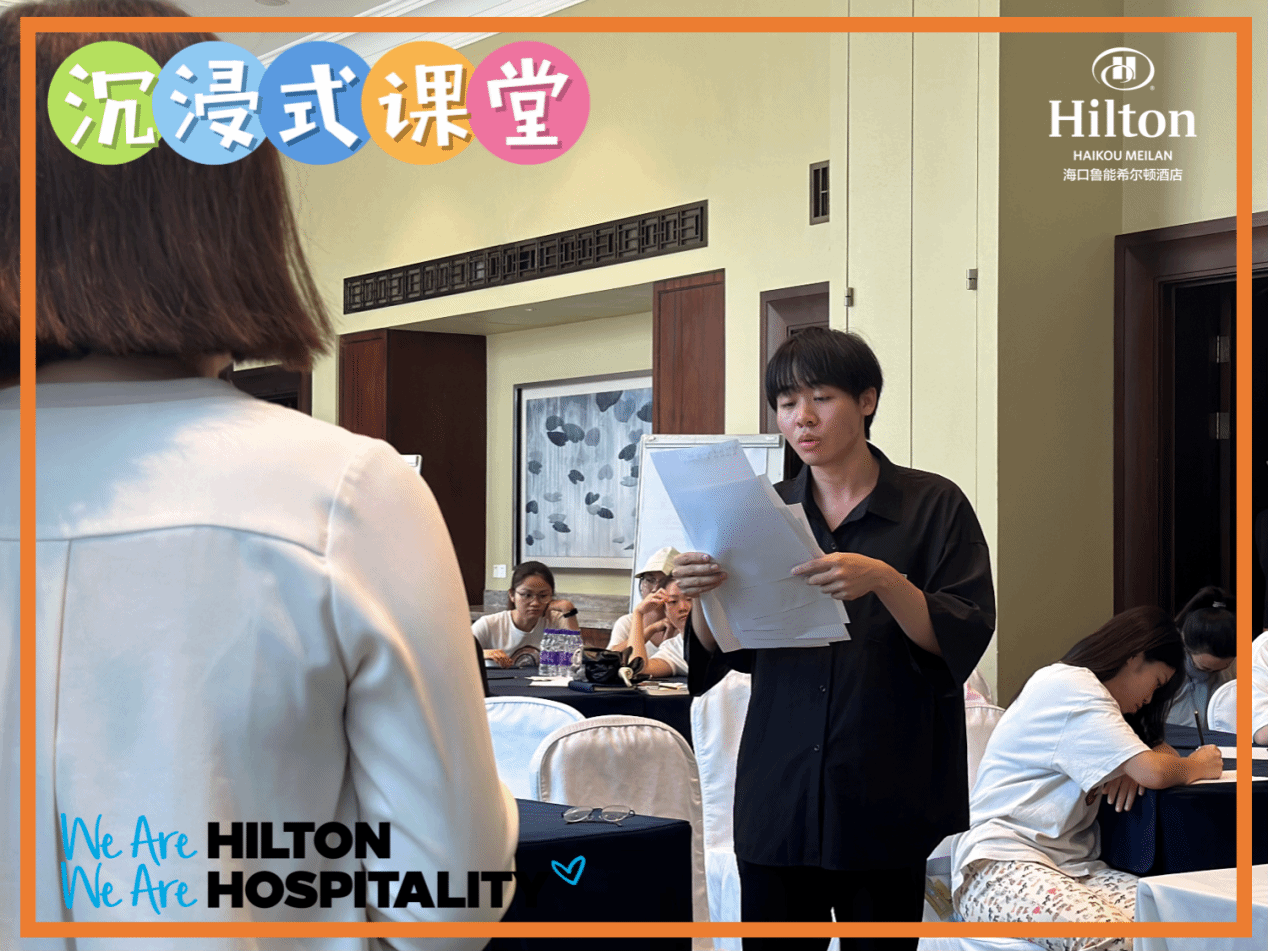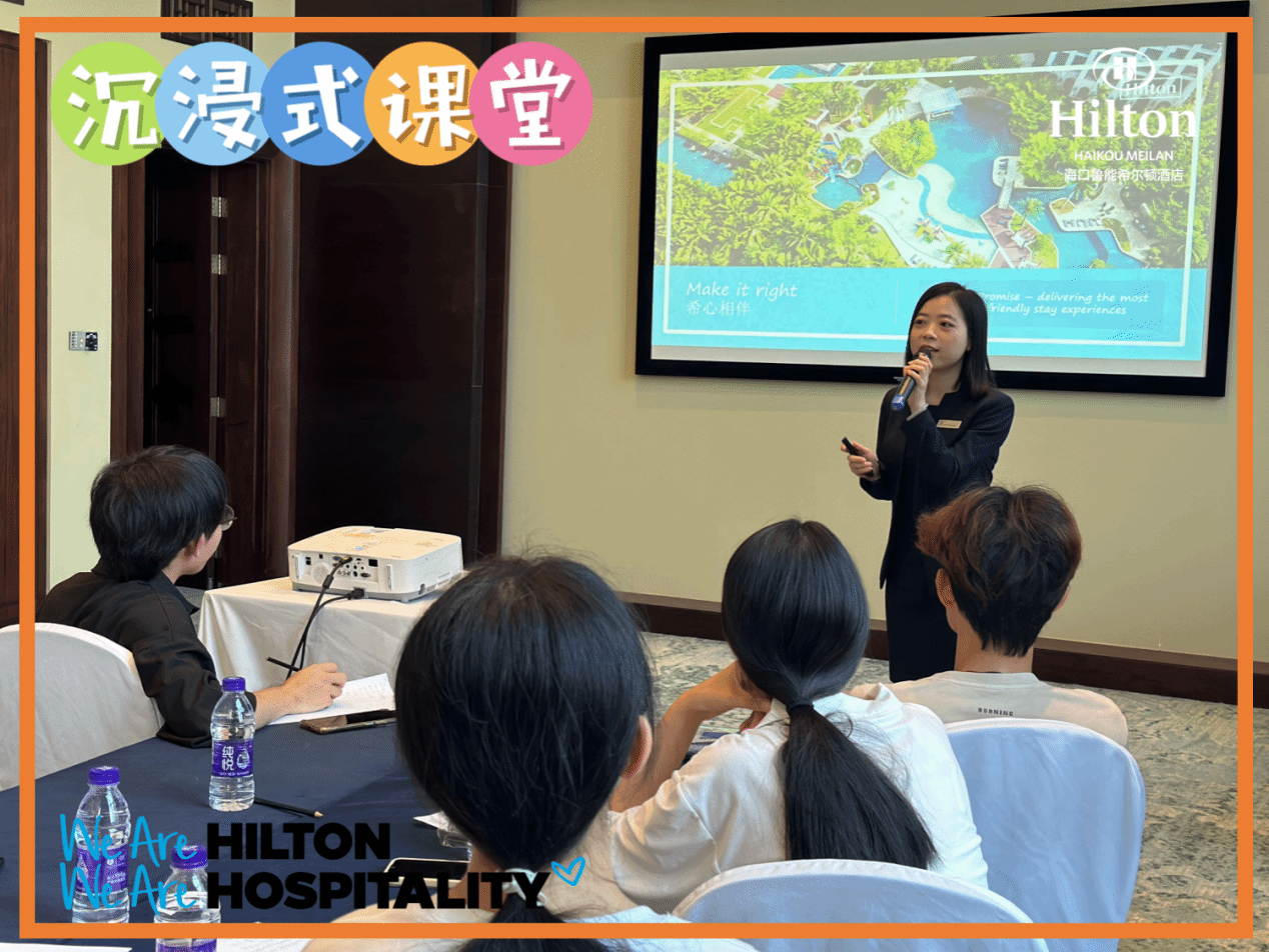 为了进一步提升酒店管理专业学生的实践能力,让课程实践学习更直观和更有效果,在任课教师蔡风娃的带领下,我院2022酒店管理1班学生于4月16日下午在海口鲁能希尔顿酒店开展了酒店前厅与客房管理课程的沉浸式课堂项目。学生们亲身走进酒店,学习并体验处理客人投诉的全过程。本次沉浸式课堂由酒店人力资源总监李杨、培训与发展经理易梦娜和前厅部经理宋艳共同主讲。