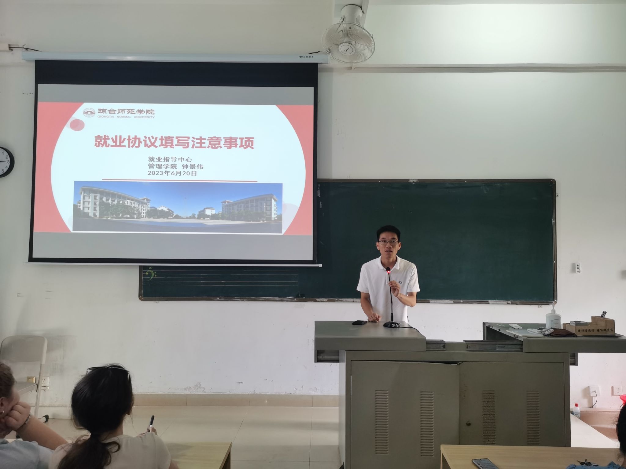 学院就业辅导员钟景伟老师详细讲解了就业协议填写注意事项,强调了就业协议规范填写的重要性,提醒学生注意专业课程学分的修读和第二课堂学分是否达到毕业要求,并及时在规定时间内完成,以免影响毕业学分审核。