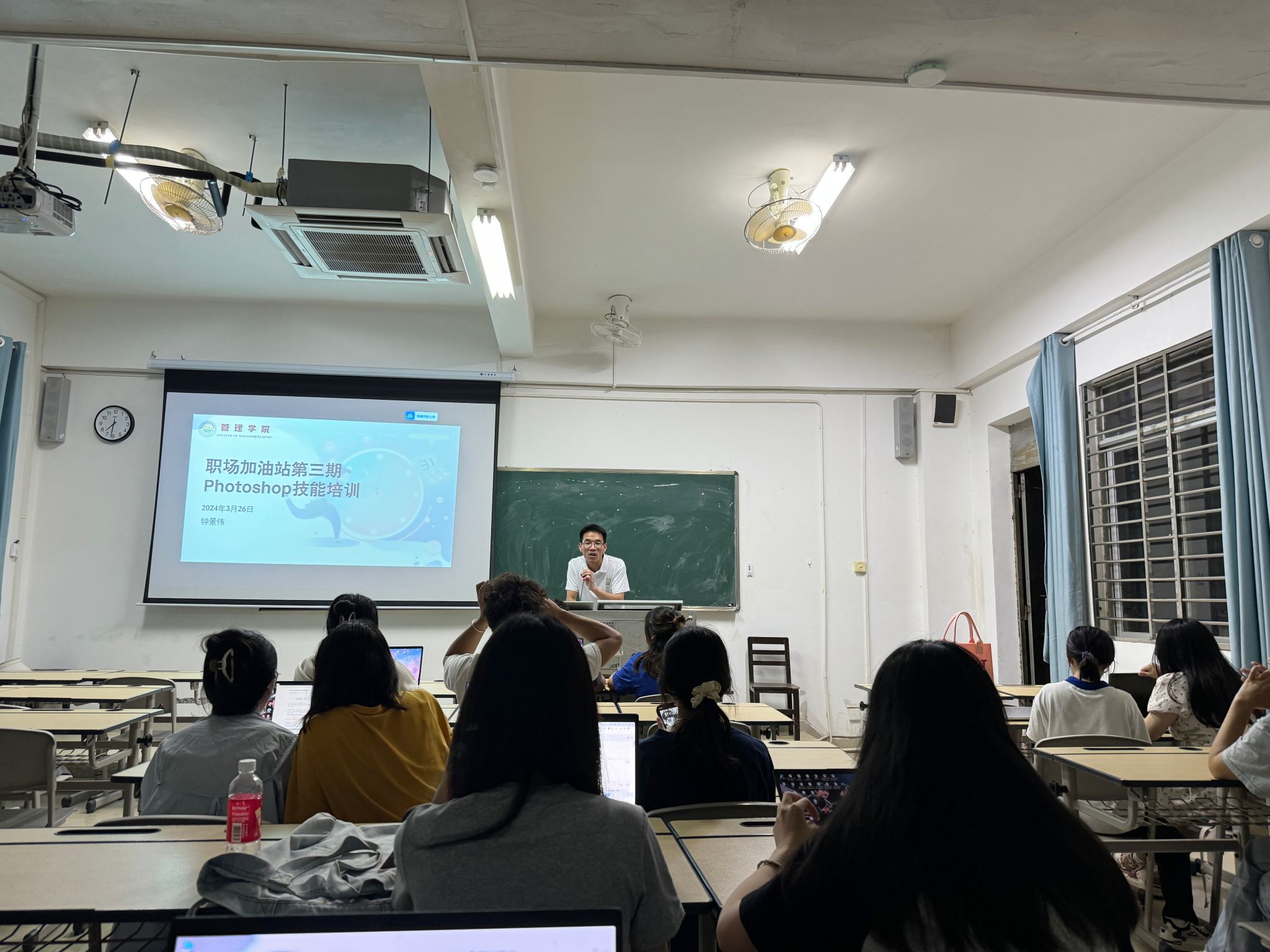 3月26日晚上,我院在培训楼312教室成功举办了职场加油站第三期之Photoshop技能培训,此次培训旨在增强学生的Photoshop软件应用能力,提升设计审美素养,助力学生在学习和未来的职业生涯中能够熟练运用Photoshop技能。本次培训活动由管理学院辅导员钟景伟老师主讲。