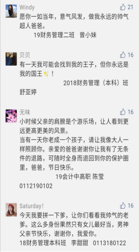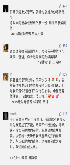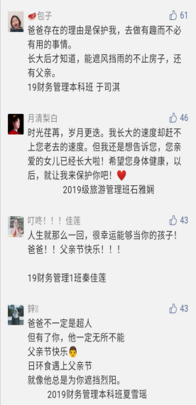活动以留言形式开展,同学们回忆和父亲相处的时光,感受父爱的沉静与伟大,用真挚的话语表达了对父亲的崇拜与爱意,写下了对父亲的感恩与祝福。