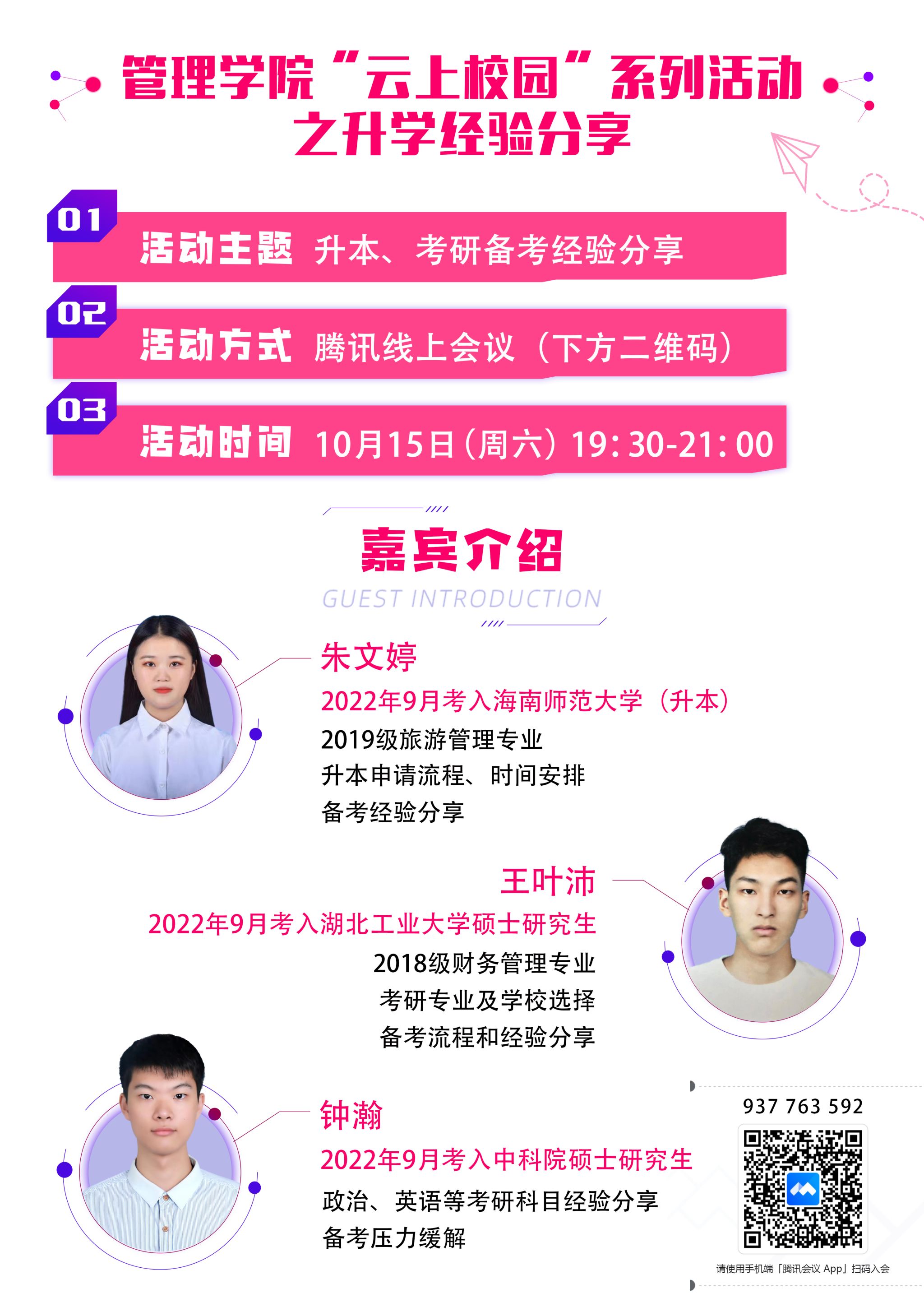 我们非常荣幸邀请到2022年9月升本与考研成功的学长学姐们来进行经验分享,他们分别是2019级旅游管理专业 朱文婷(升本到海南师范大学),2018级财务管理专业 王叶沛(硕士研究生上岸湖北工业大学),钟瀚(硕士研究生上岸中科院)。
